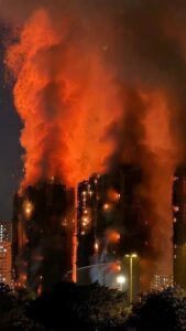 The fire ignited in the mid-afternoon and rapidly consumed the scaffold-covered exteriors. Video footage captured heavy smoke and flames bursting from windows across multiple towers as night approached. Firefighters battled the inferno using ladder trucks as officials raised the alert level to 5 Hong Kong’s highest fire emergency rating.