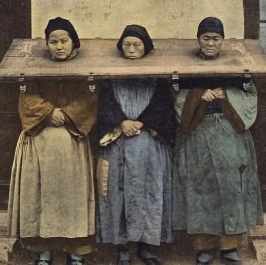 One of the most feared was the cangue: a heavy wooden collar locked around the neck, trapping its wearer in public view.
