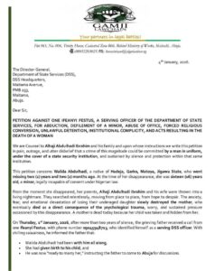 In the petition addressed to the DSS Director-General on behalf of the girl’s father, Alhaji Abdulhadi Ibrahim, and his family, the law firm accused the DSS officer of abducting the teenager from the Hadejia area of Jigawa State when she was allegedly just 16 years old.