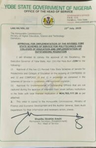 In a letter dated 23rd July, 2025, addressed to the Honourable Commissioner for Higher Education, Science and Technology, the Permanent Secretary (Establishment), Shuaibu Ibrahim Amshi, conveyed the approval of the Executive Governor, Hon. (Dr.) Mai Mala Buni, CON.