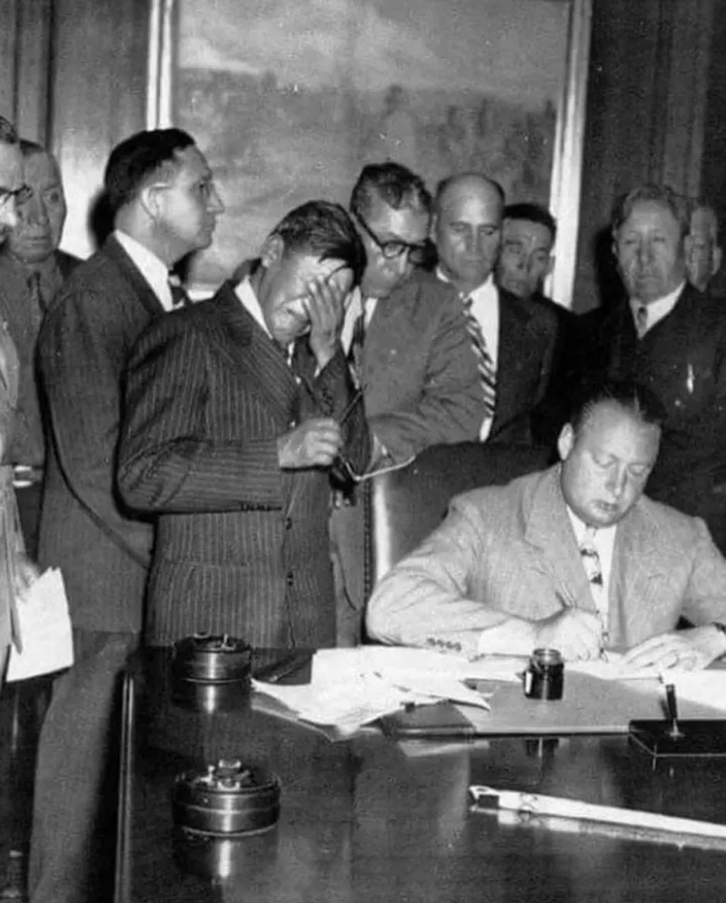 Sitting beside him is U.S. Secretary of the Interior Julius Krug, signing a contract that would force the sale of 155,000 acres of tribal land in North Dakota to the federal government.