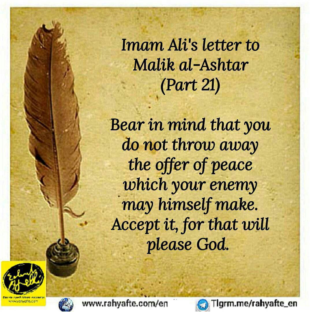 Bear in mind that you do not throw away the offer of peace which your enemy may himself make. Accept it, for that will please God. Peace is a source of comfort to the army, it reduces your worries and promotes order in the state.