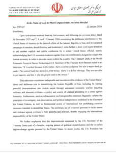 “This admission constitutes indisputable evidence of the United States’ direct and deliberate role in destabilizing Iran,” the letter states. Iran claims that the U.S. deliberately targeted ordinary civilians and turned peaceful demonstrations into violent unrest, a policy it describes as a potential crime against humanity.