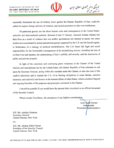 The Iranian mission urged Secretary-General Guterres to remind the United States of its obligations under the UN Charter to respect state sovereignty, refrain from coercion, and avoid unlawful interference in internal affairs.