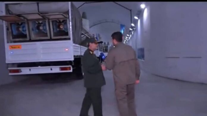 In footage broadcast by Iranian state television, the commander of the Islamic Revolutionary Guard Corps (IRGC) Navy, Alireza Tangsiri, appeared inside extensive submarine missile facilities, showing rows of rockets prepared for launch.