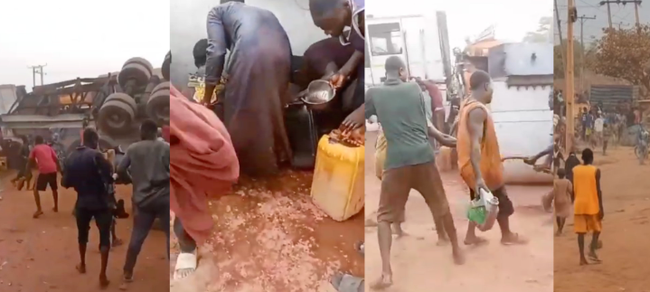 In a widely circulated video, locals, mostly young people, were seen gathering around a broken-down truck. While some attempted to scoop the contents, others fled in different directions, likely to avoid any potential danger.
