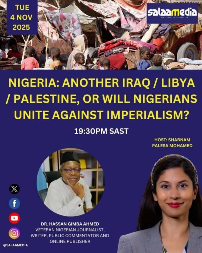 Humanitarian broadcaster Salaamedia will host a live panel discussion tonight at 19:30 PM SAST / 6:30 PM WAT, moderated by Barrister Shabnam Palesa Mohamed, under the theme “Nigeria: Another Iraq/ Libya/Palestine, or will Nigerians unite against imperialism?”