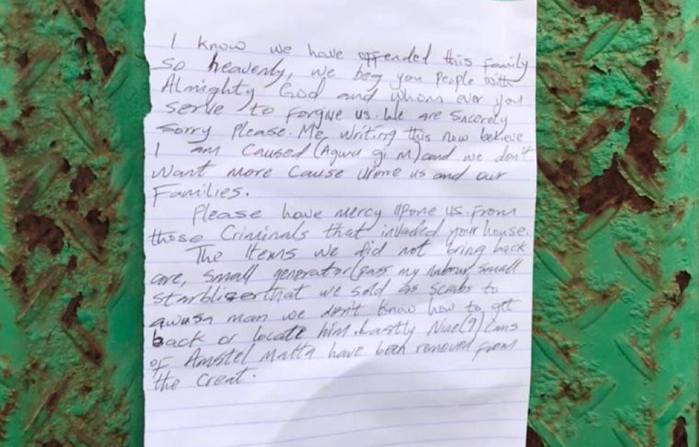 “Please have mercy upon those criminals that invaded your house. The items we did not bring back are small generator (pass my neighbour), small stabilizer we sold as scrab to awusa man we don’t know how to get back or locate. Finally nine cans of amstel malt have been removed from creat (sic).”